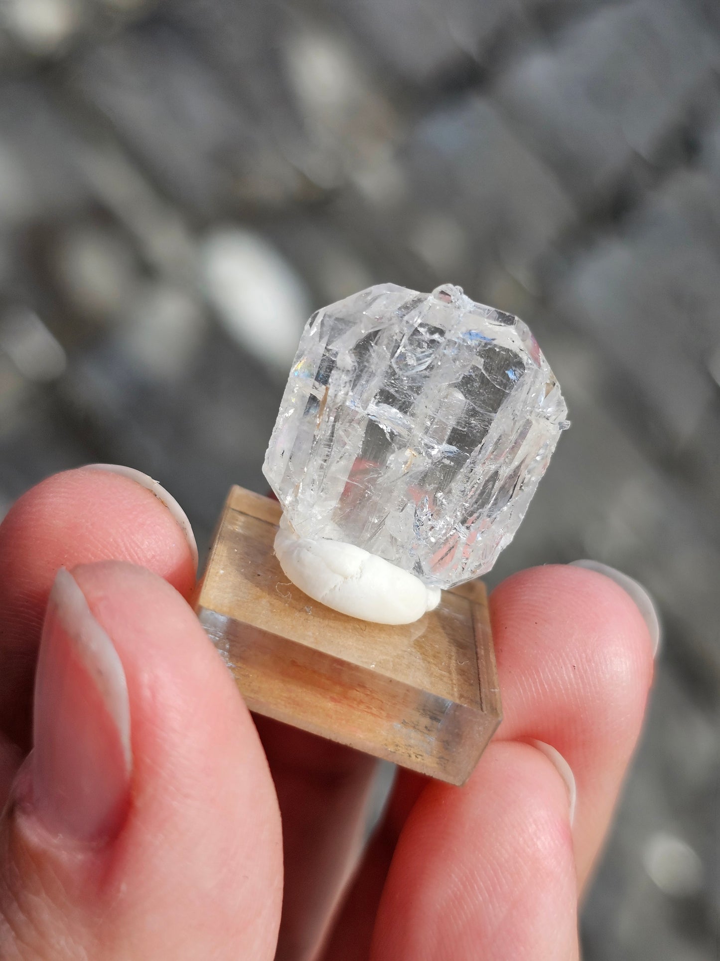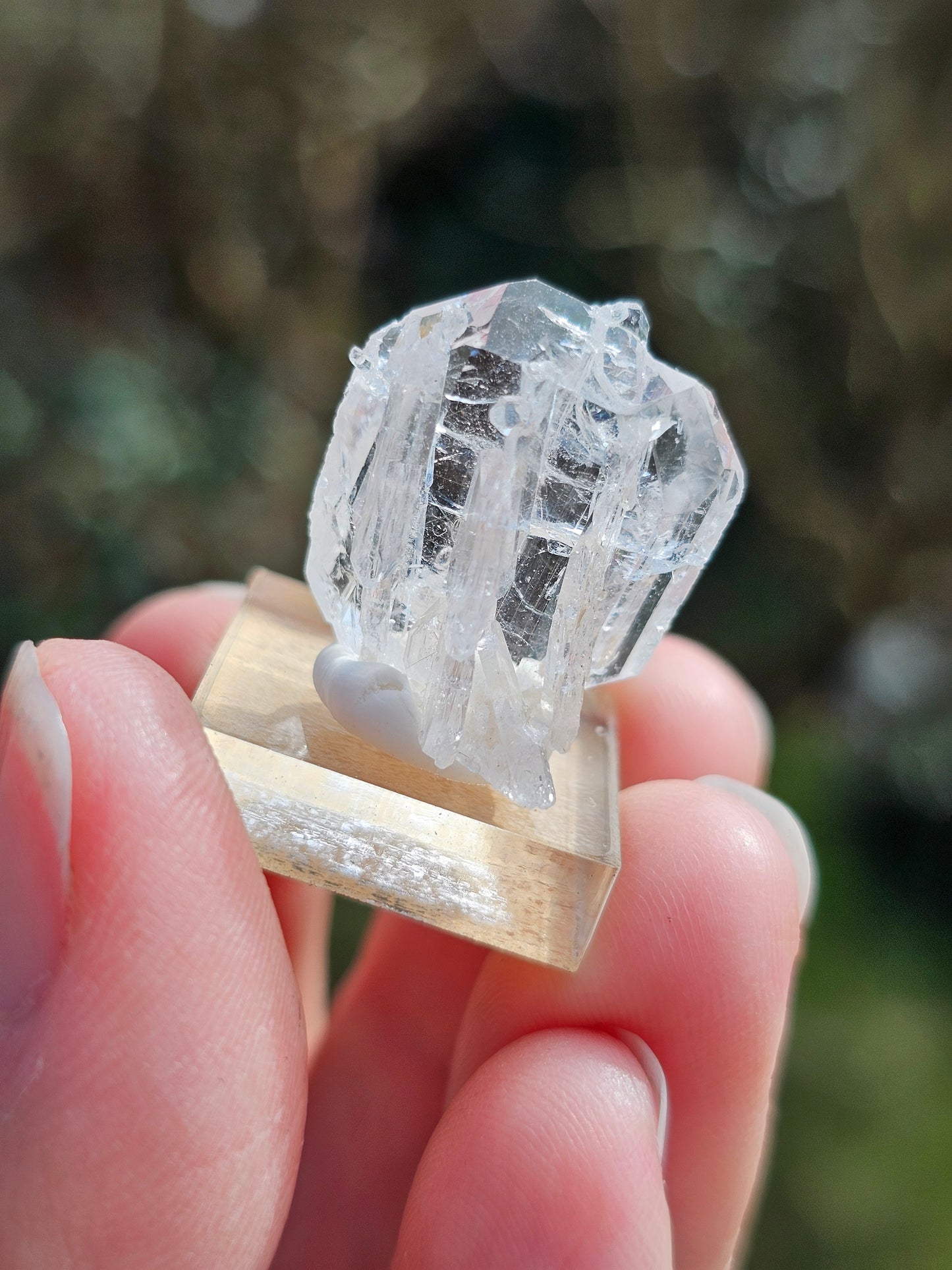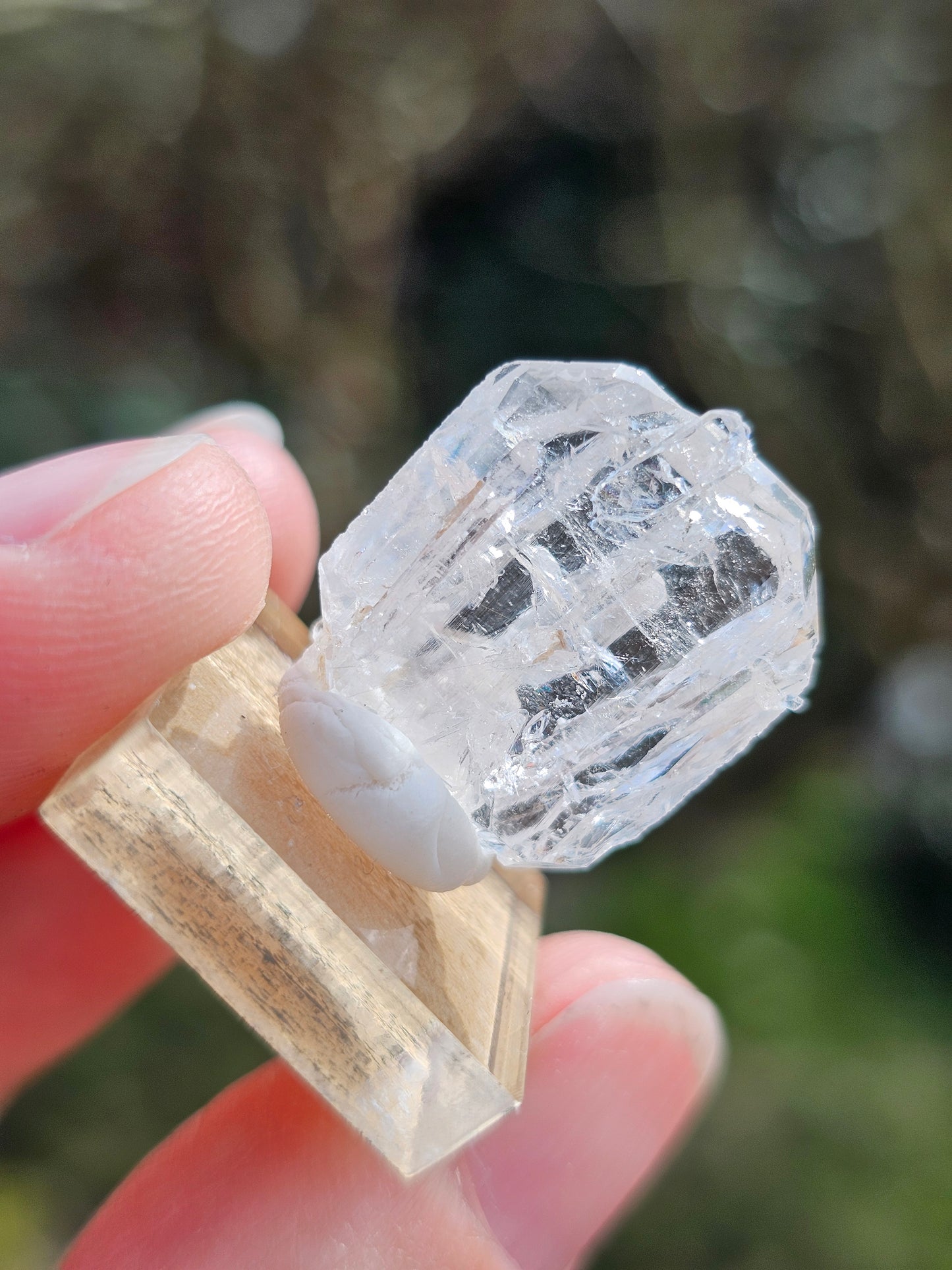 Jolie Quartz à âme du Pakistan sur socle, également appelé faden quartz ou quartz tabulaire. La ligne blanche représente une "fracture" le long de laquelle le quartz à recristallisé.