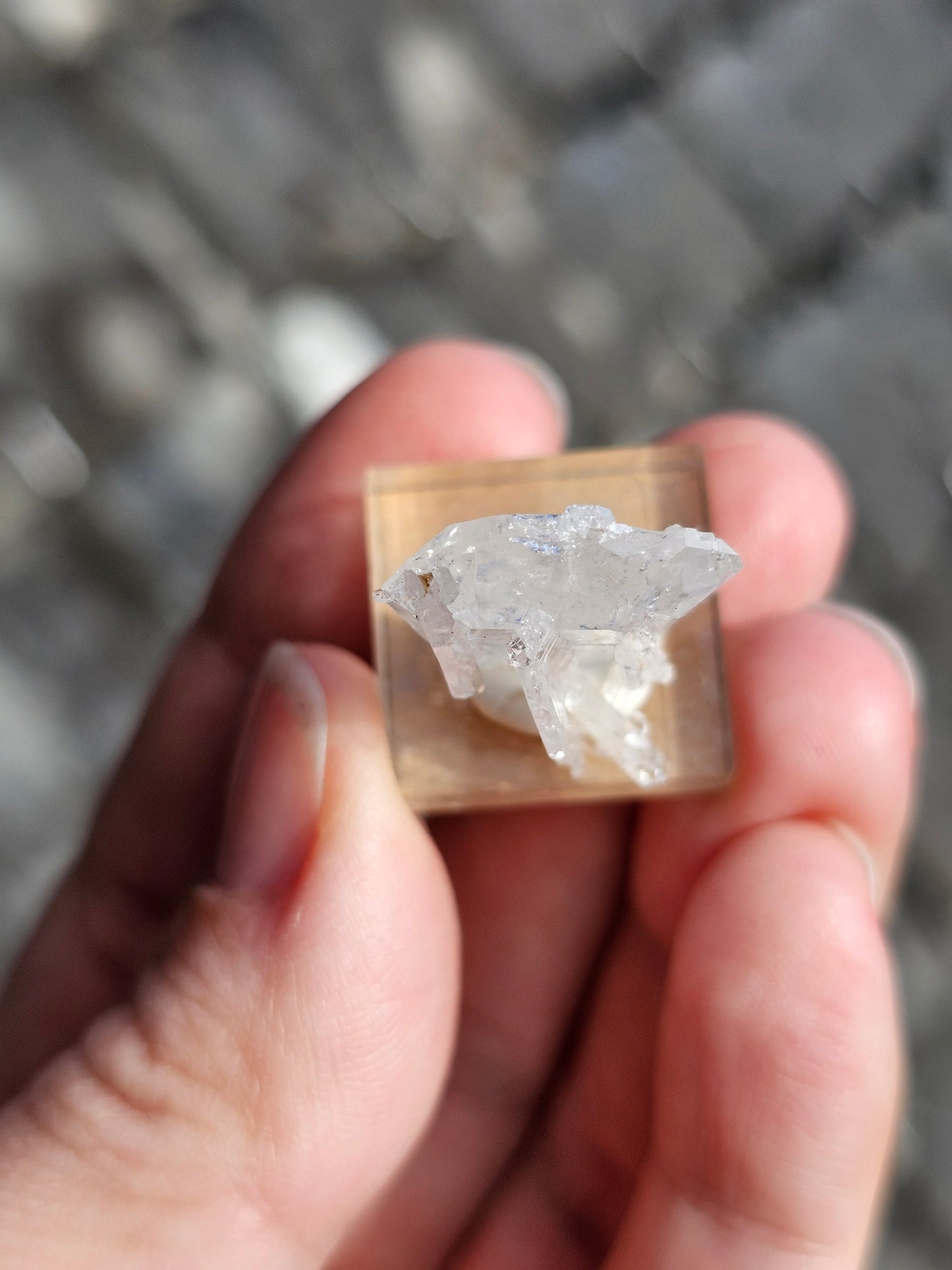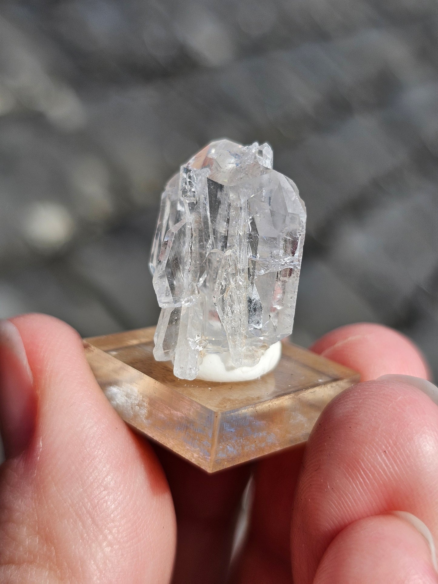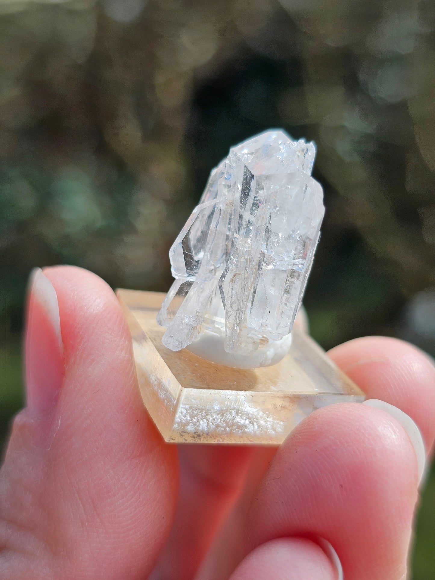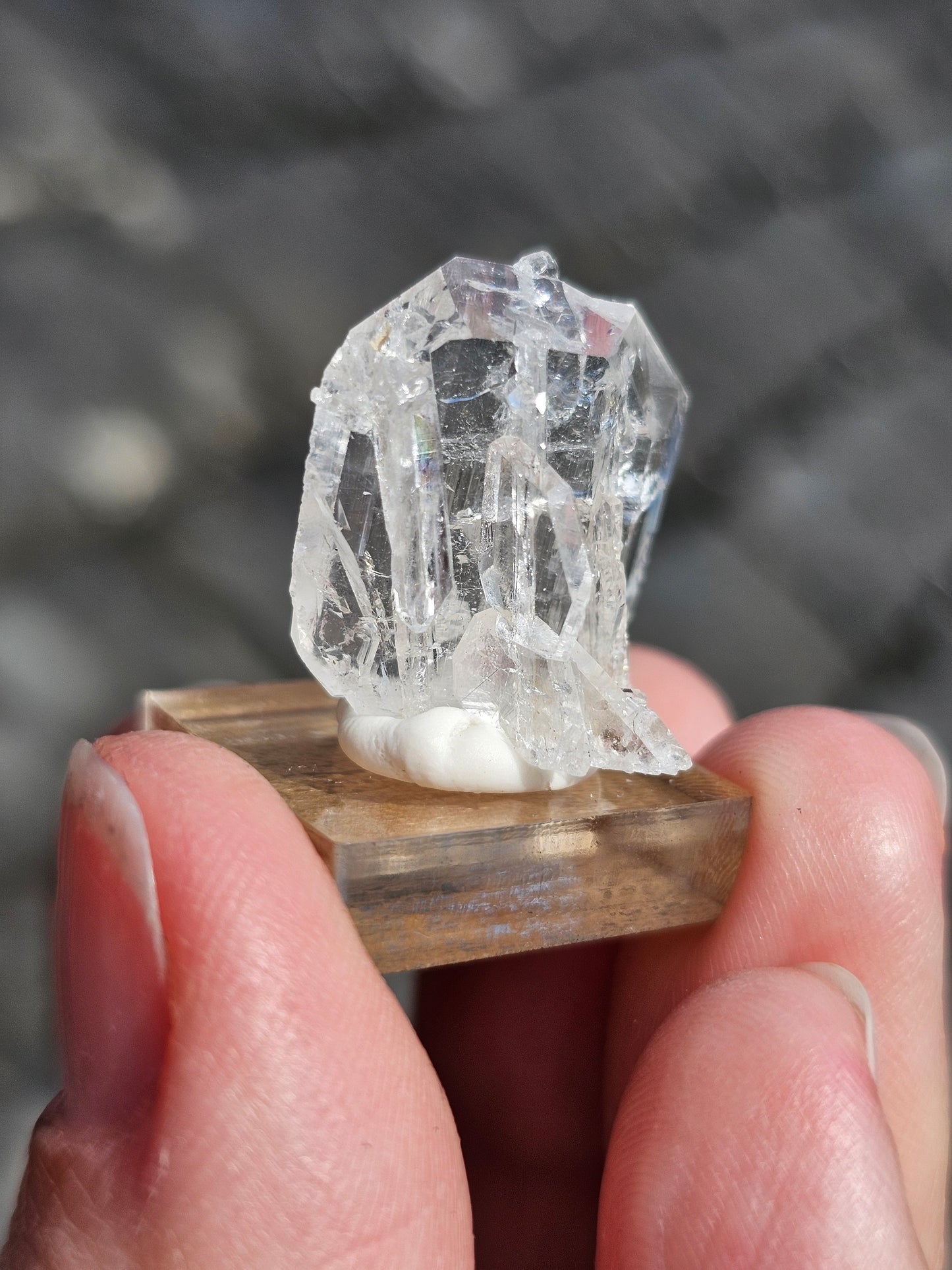 Jolie Quartz à âme du Pakistan sur socle, également appelé faden quartz ou quartz tabulaire. La ligne blanche représente une "fracture" le long de laquelle le quartz à recristallisé.