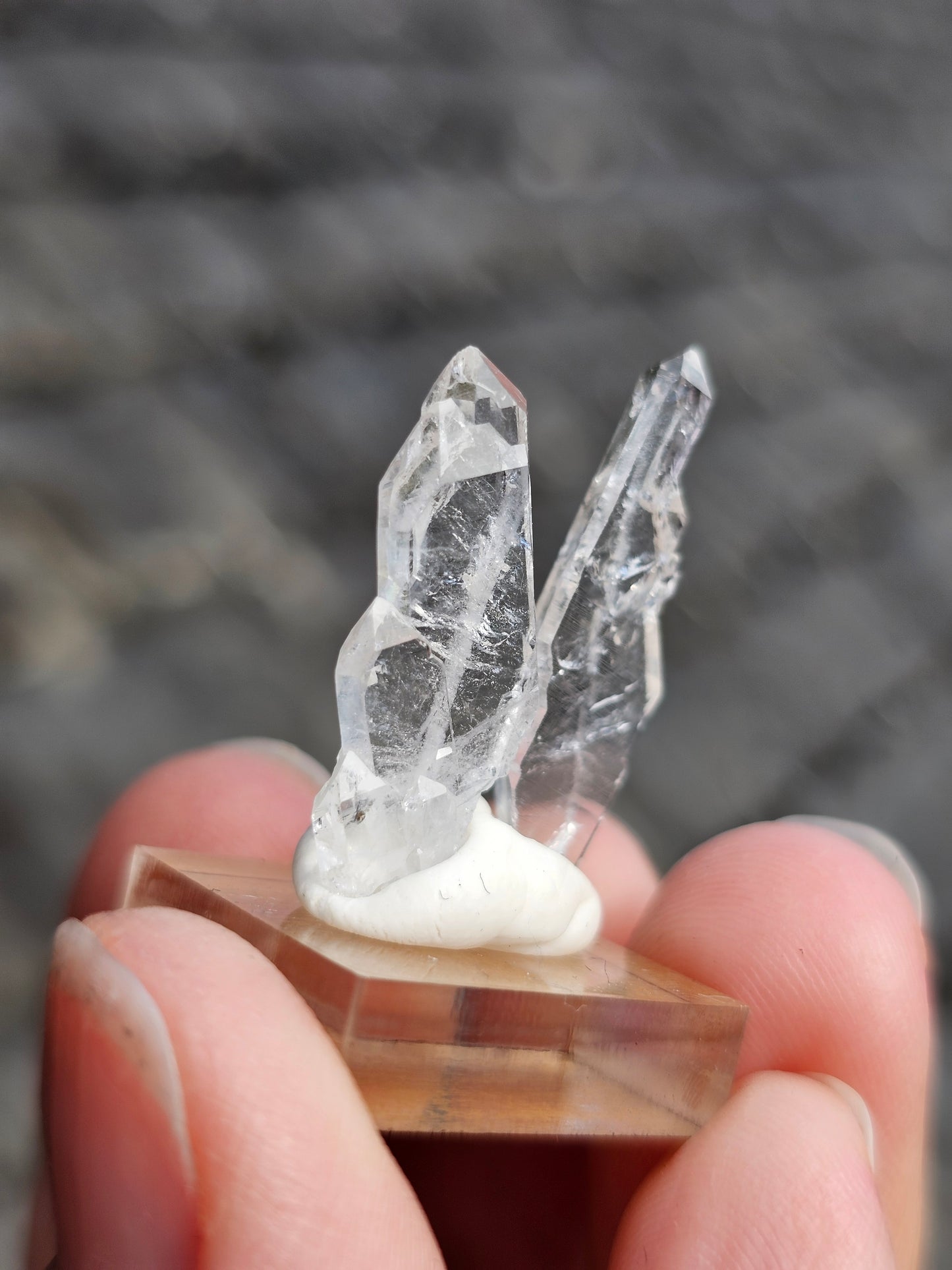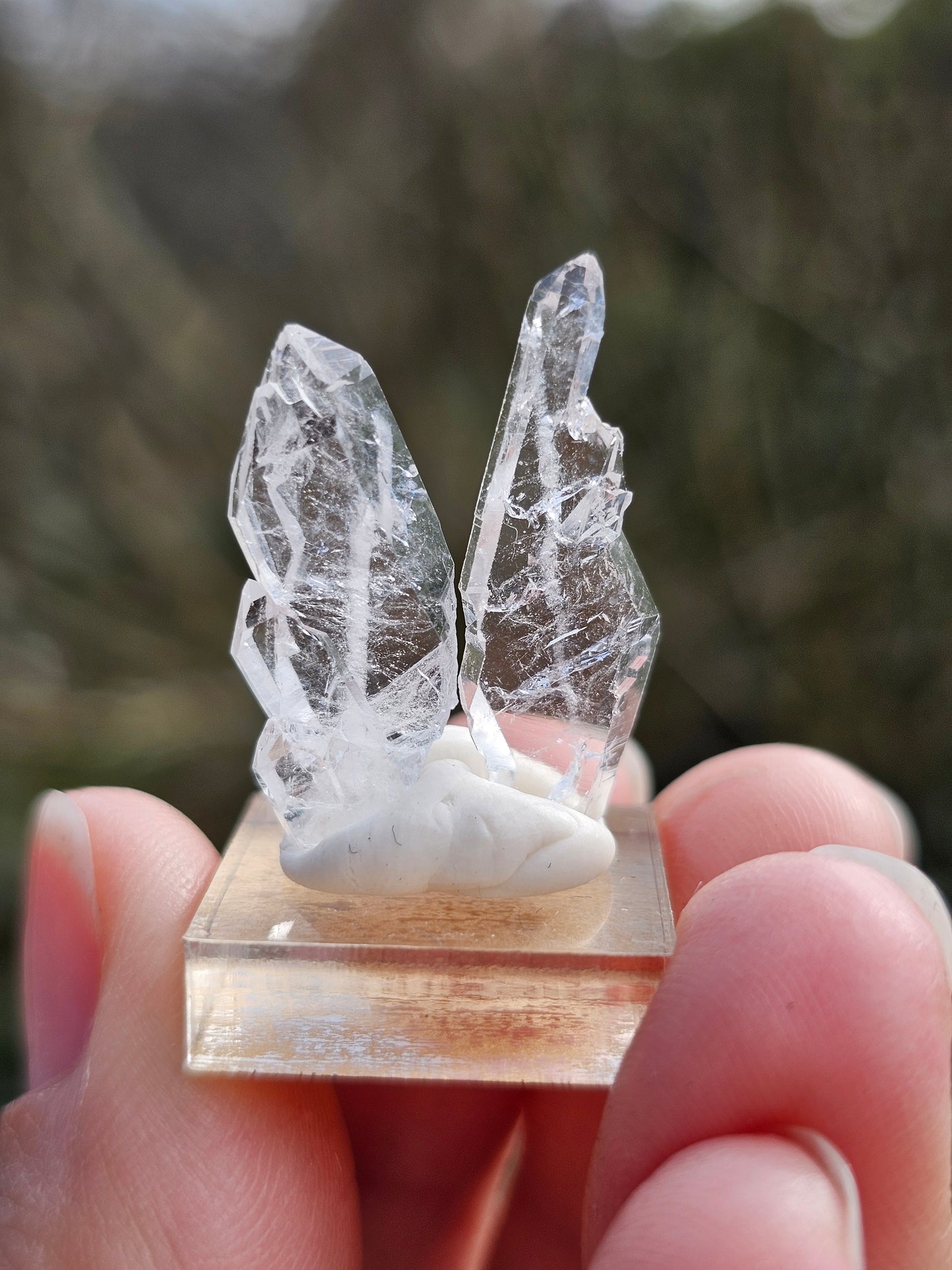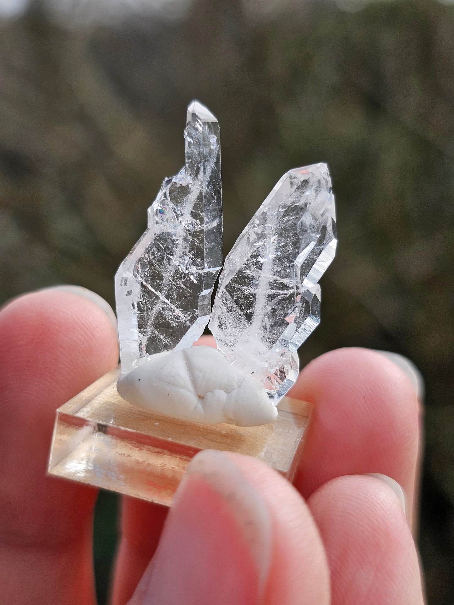 2 Jolis Quartz à âme du Pakistan sur socle, également appelé faden quartz ou quartz tabulaire. La ligne blanche représente une "fracture" le long de laquelle le quartz à recristallisé.