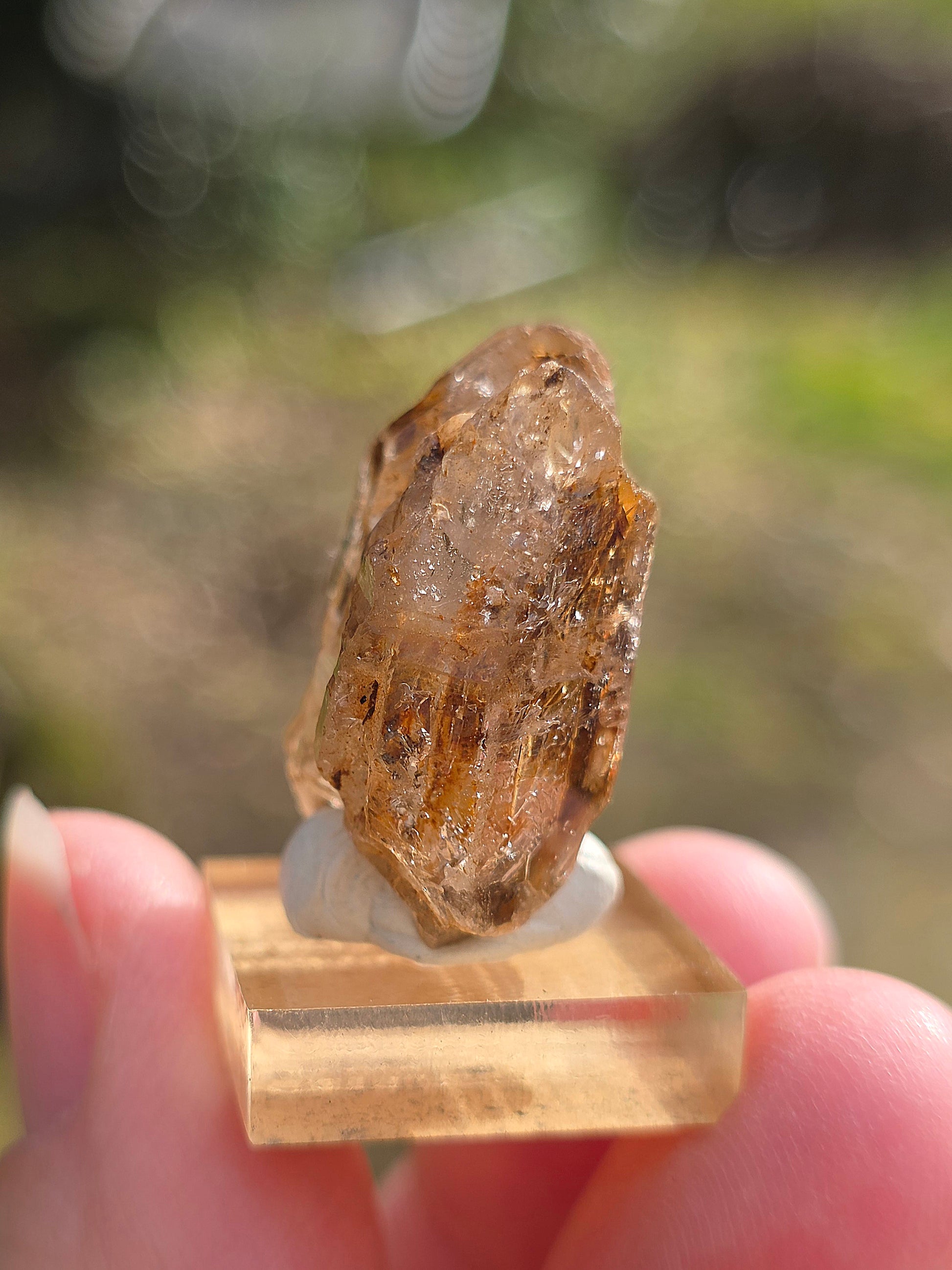 Joli petit Quartz fenêtre de Madagascar brut, réactif à la lumière ultra-violette, sur son socle en acrylique.