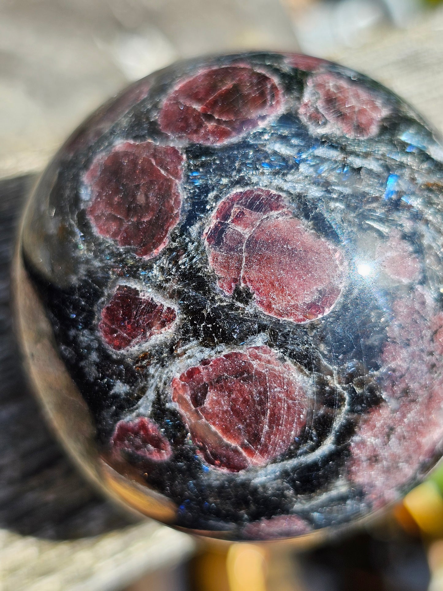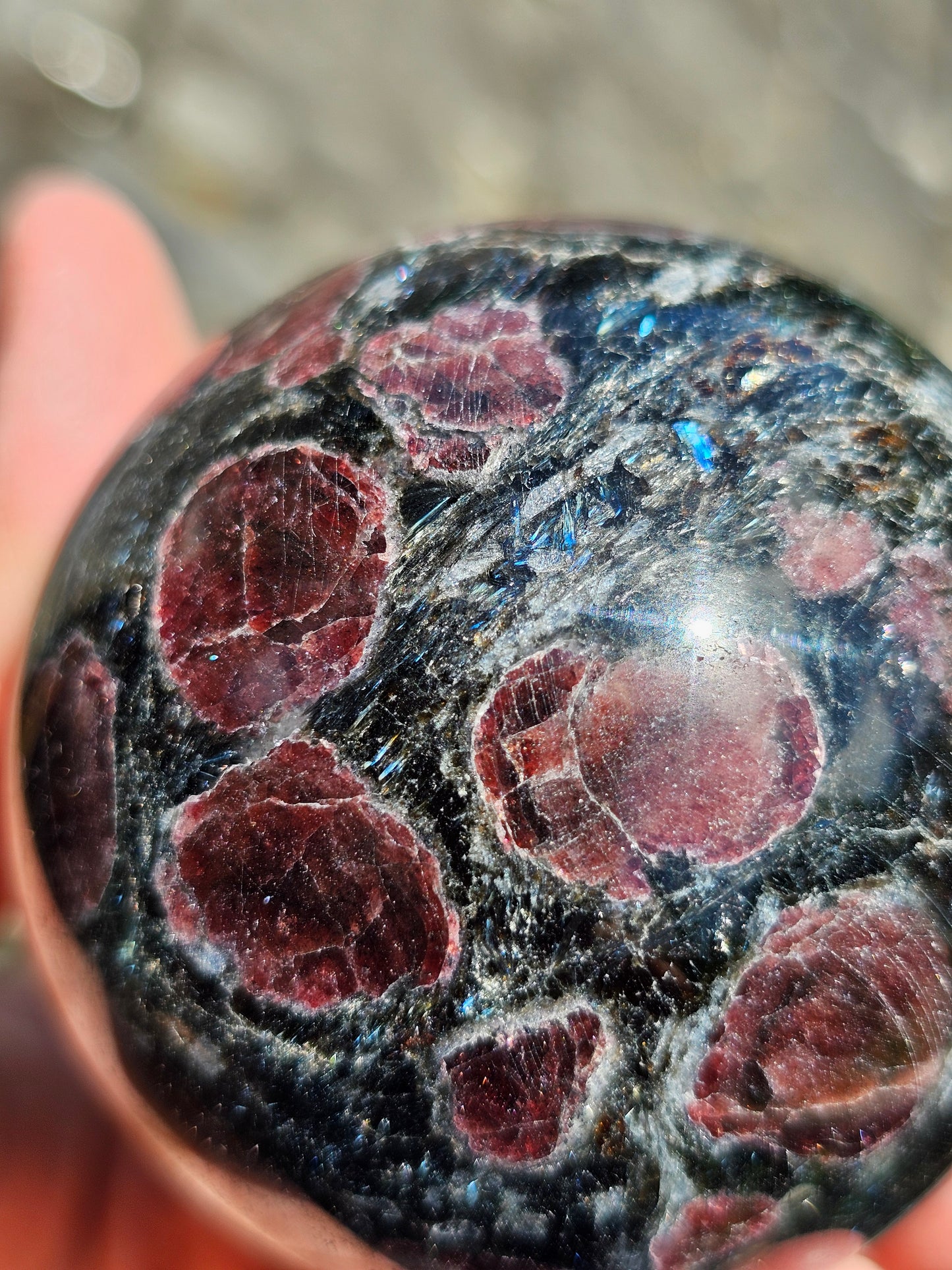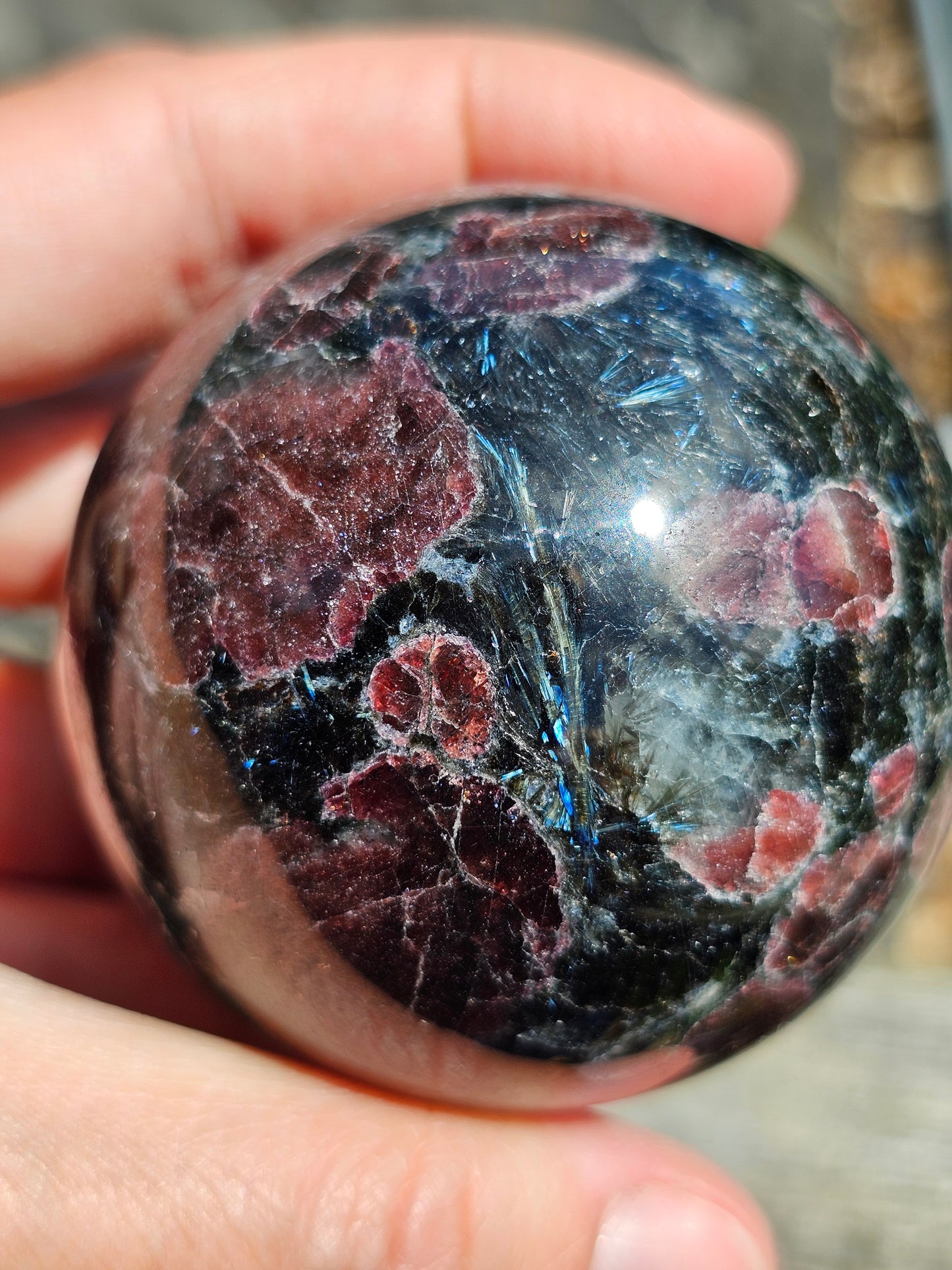 Superbe sphère de Grenat et d'Arfvedsonite de Russie avec ses beaux filaments bleus et dorés.