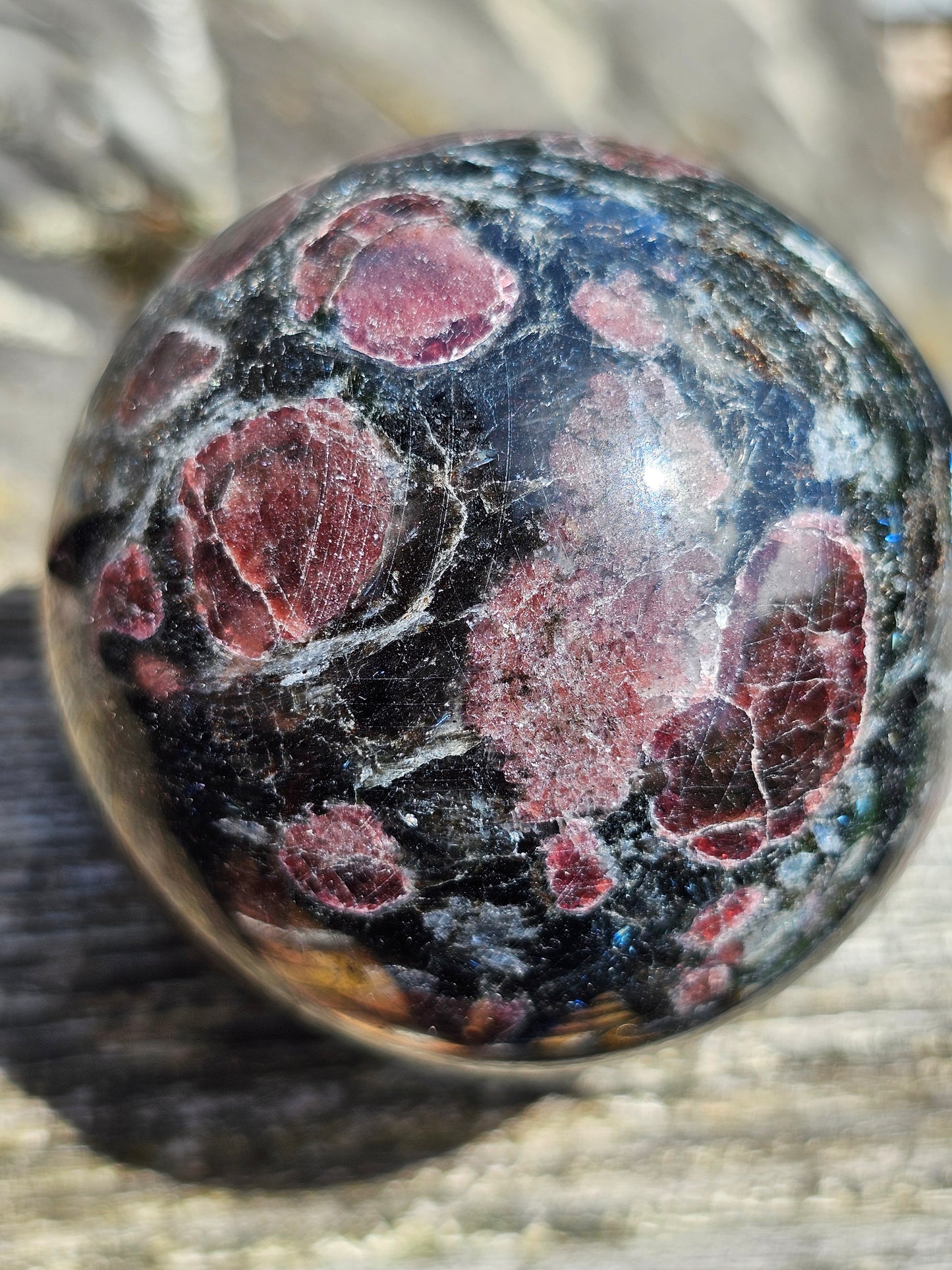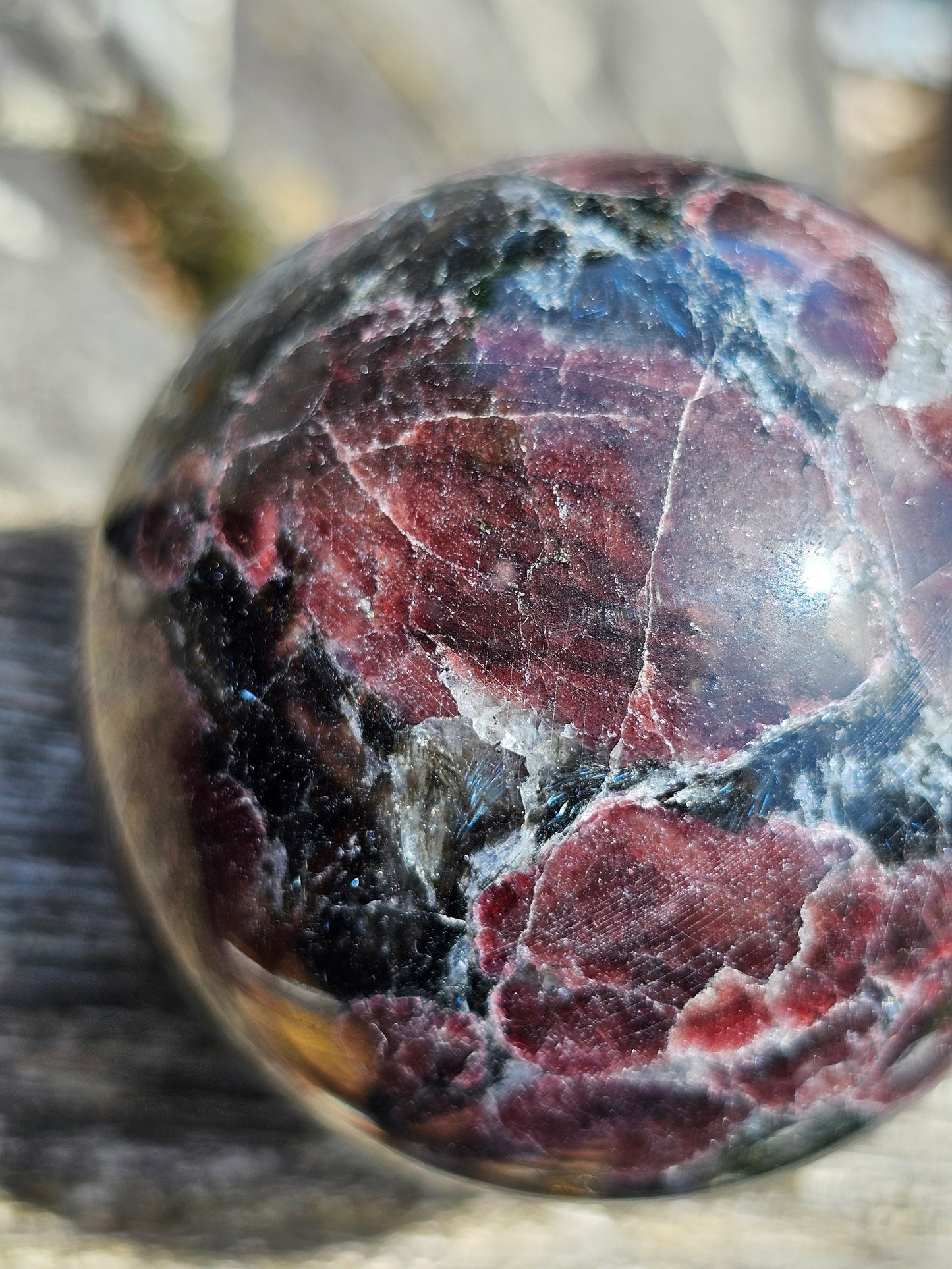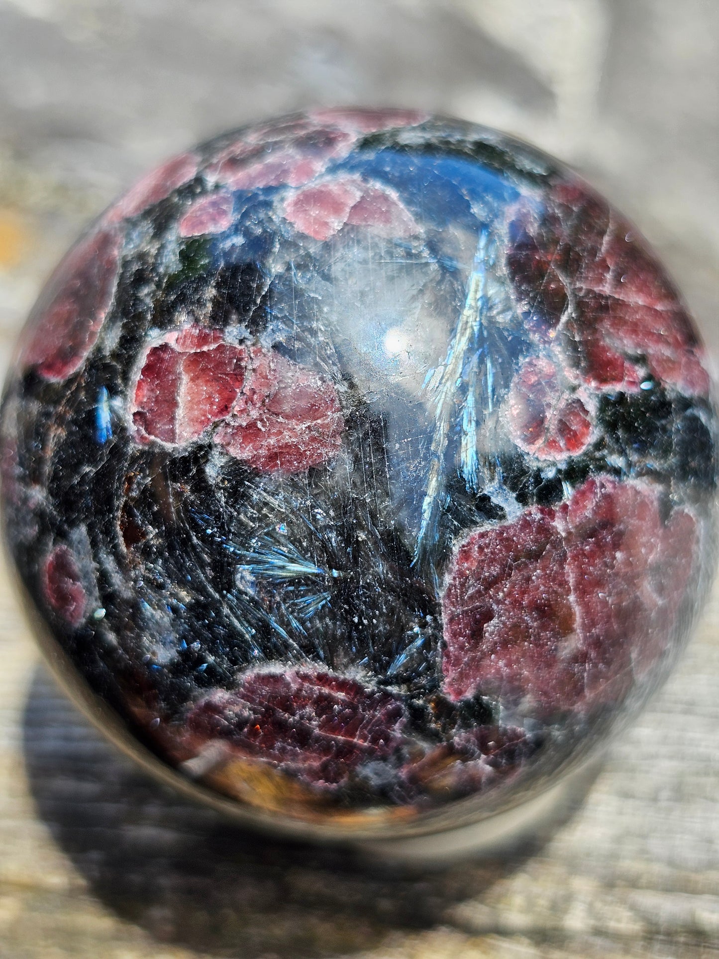 Superbe sphère de Grenat et d'Arfvedsonite de Russie avec ses beaux filaments bleus et dorés.