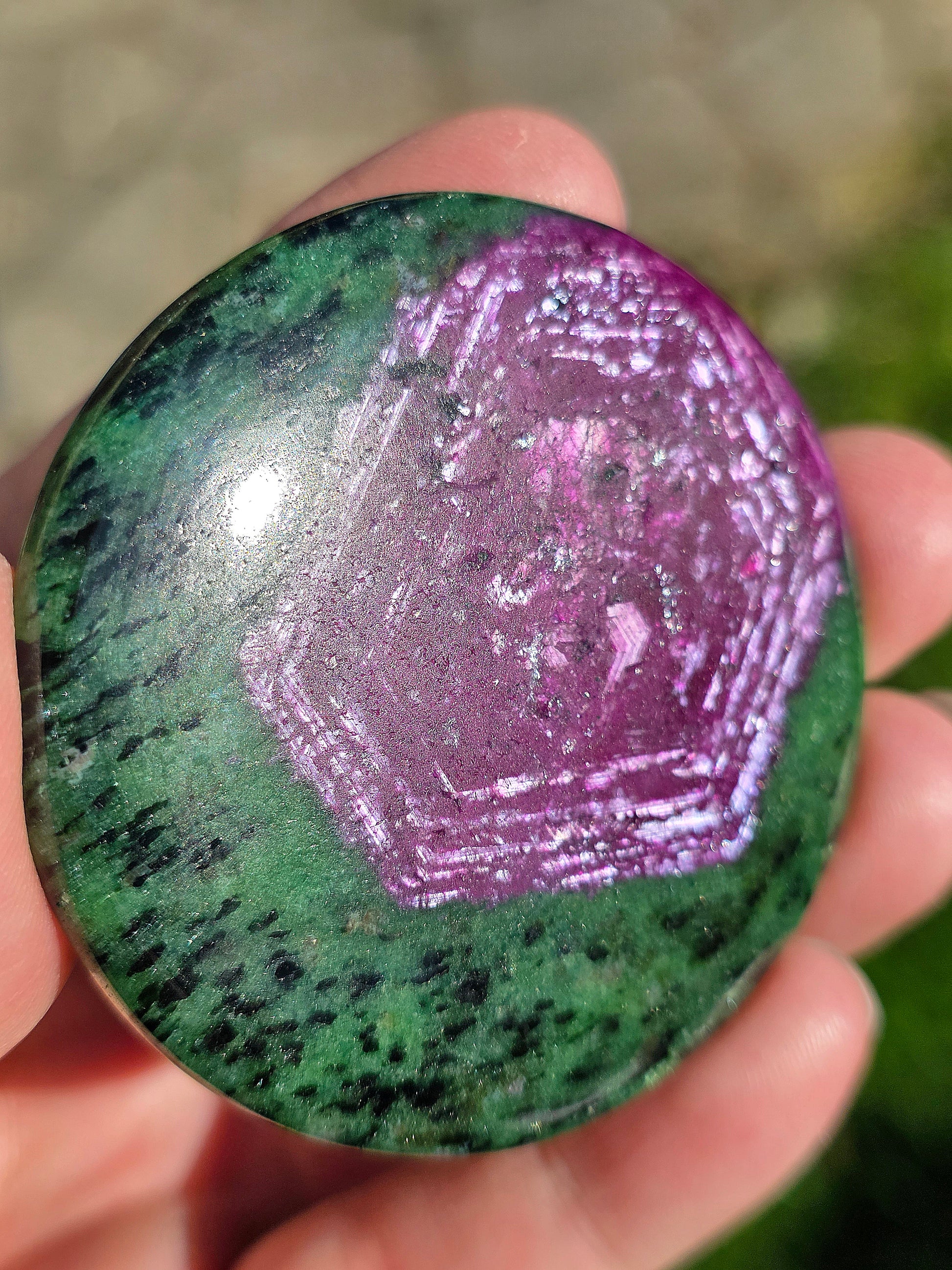 Incroyable cabochon de Zoïsite à Rubis en provenance de Tanzanie et réactif à la lumière ultra-violette. La formation est dingue ! Il est livré dans sa boîte vitrine. Une pièce d'exception pour votre collection minéralogique !