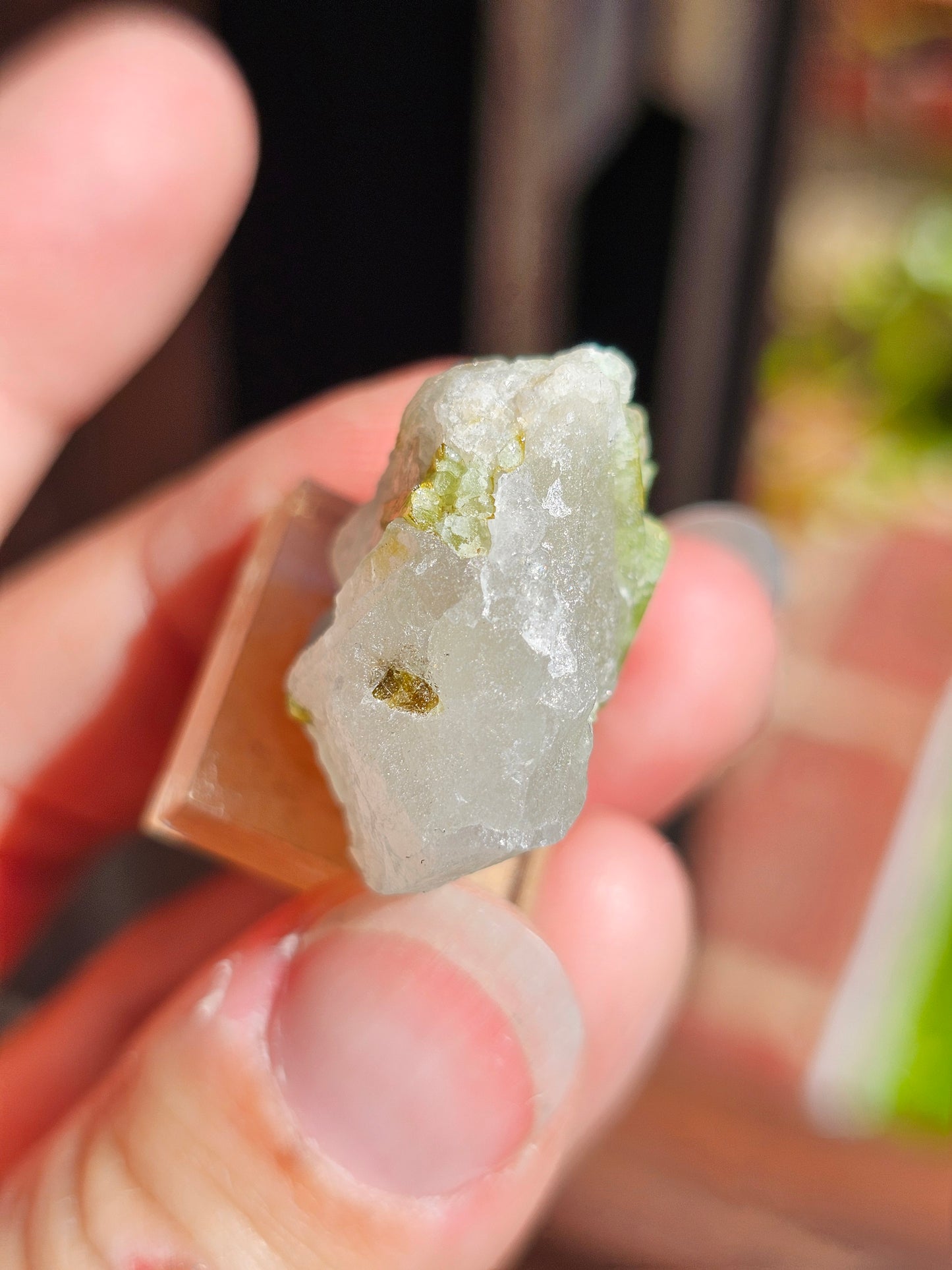 Magnifique Tourmaline verte sur Quartz du Brésil. Vendue sur son socle de collection.
