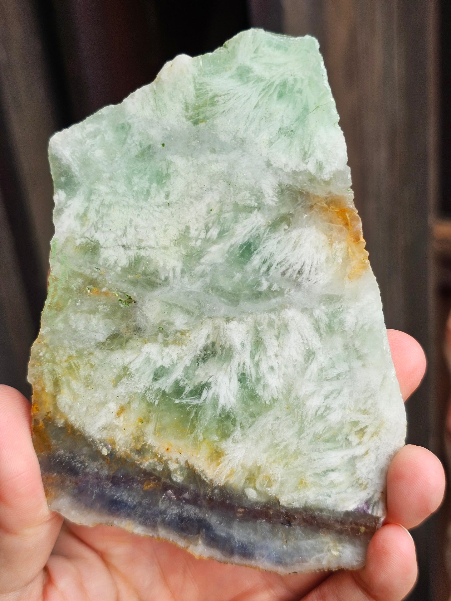 Magnifique tranche de Fluorite dite "snowflakes" ou "feather" en raison de ses inclusions blanches qui rappellent les flocons de neige ou les plumes.