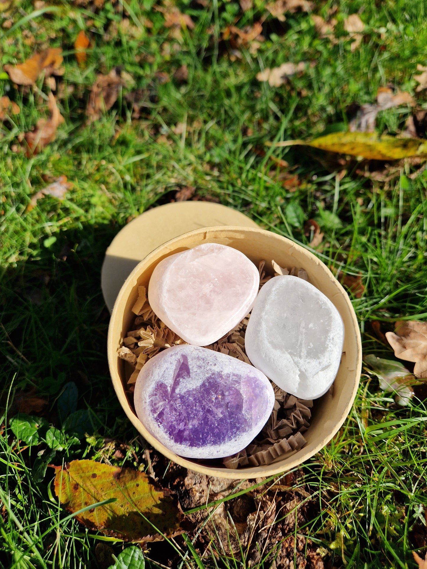 Le triangle d'or est composé de 3 pierres qui se complètent : l'Améthyste, la Quartz rose et le Cristal de roche.
