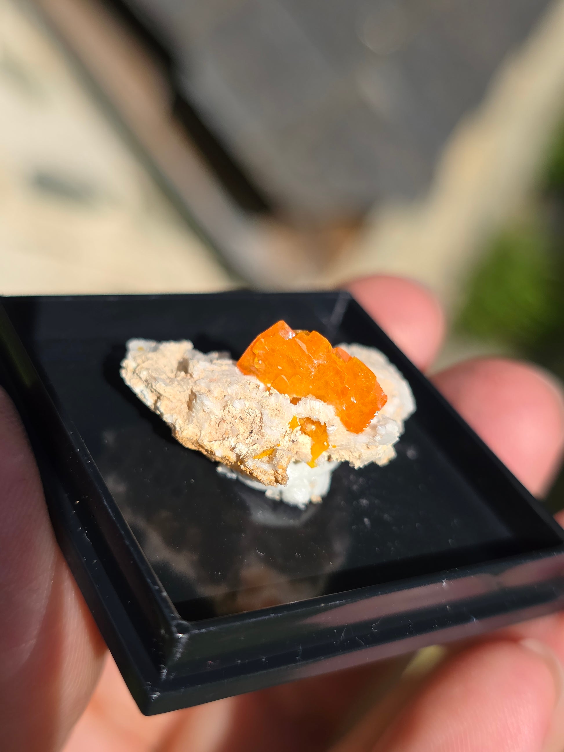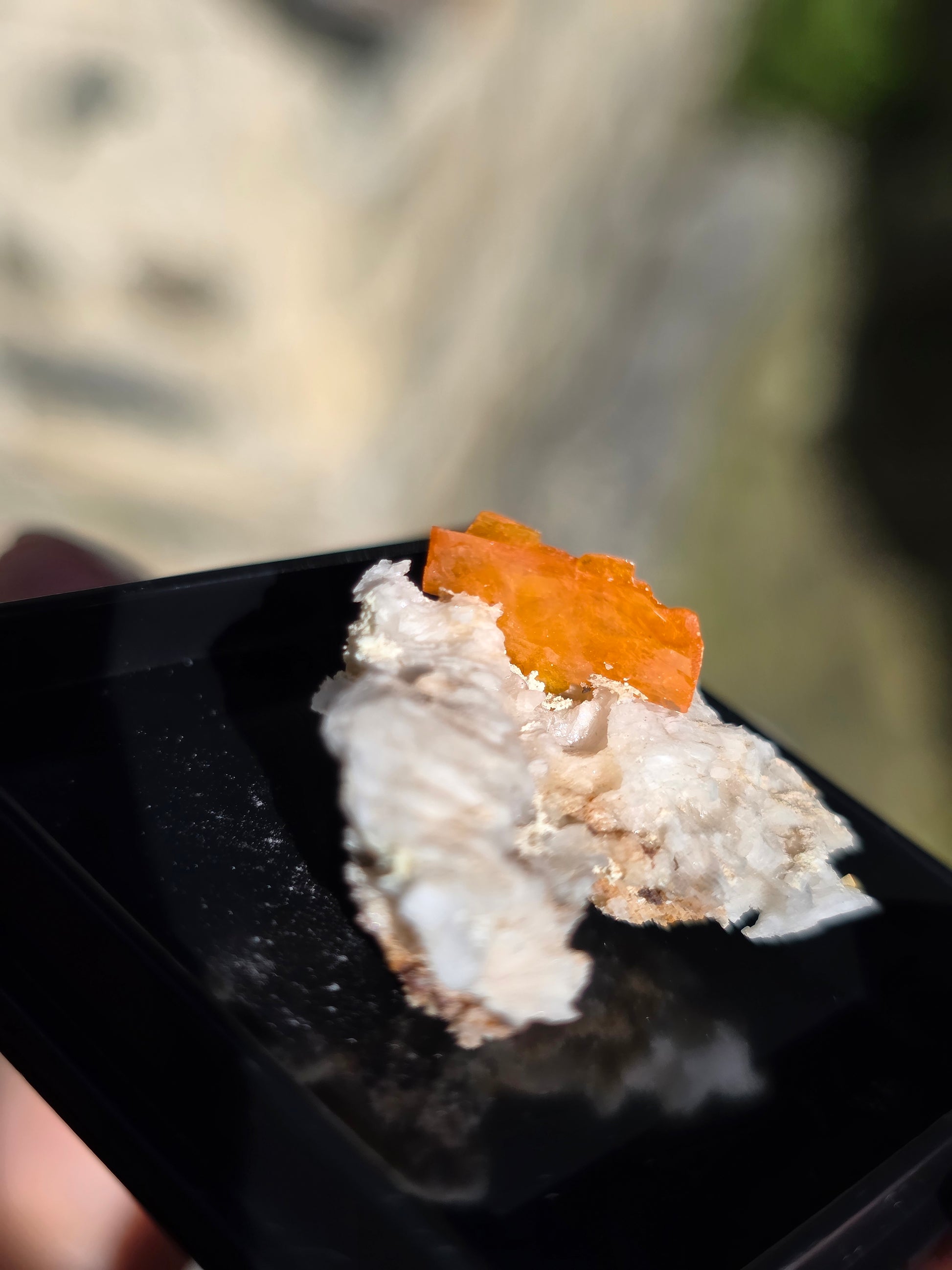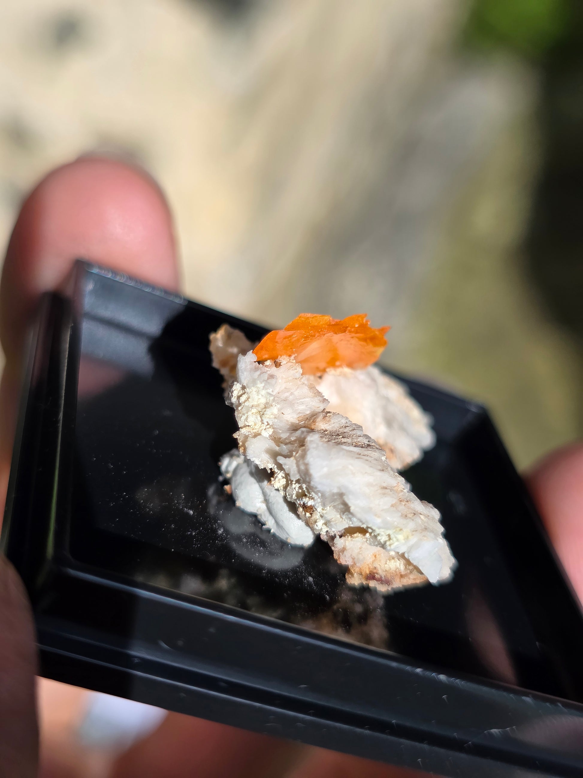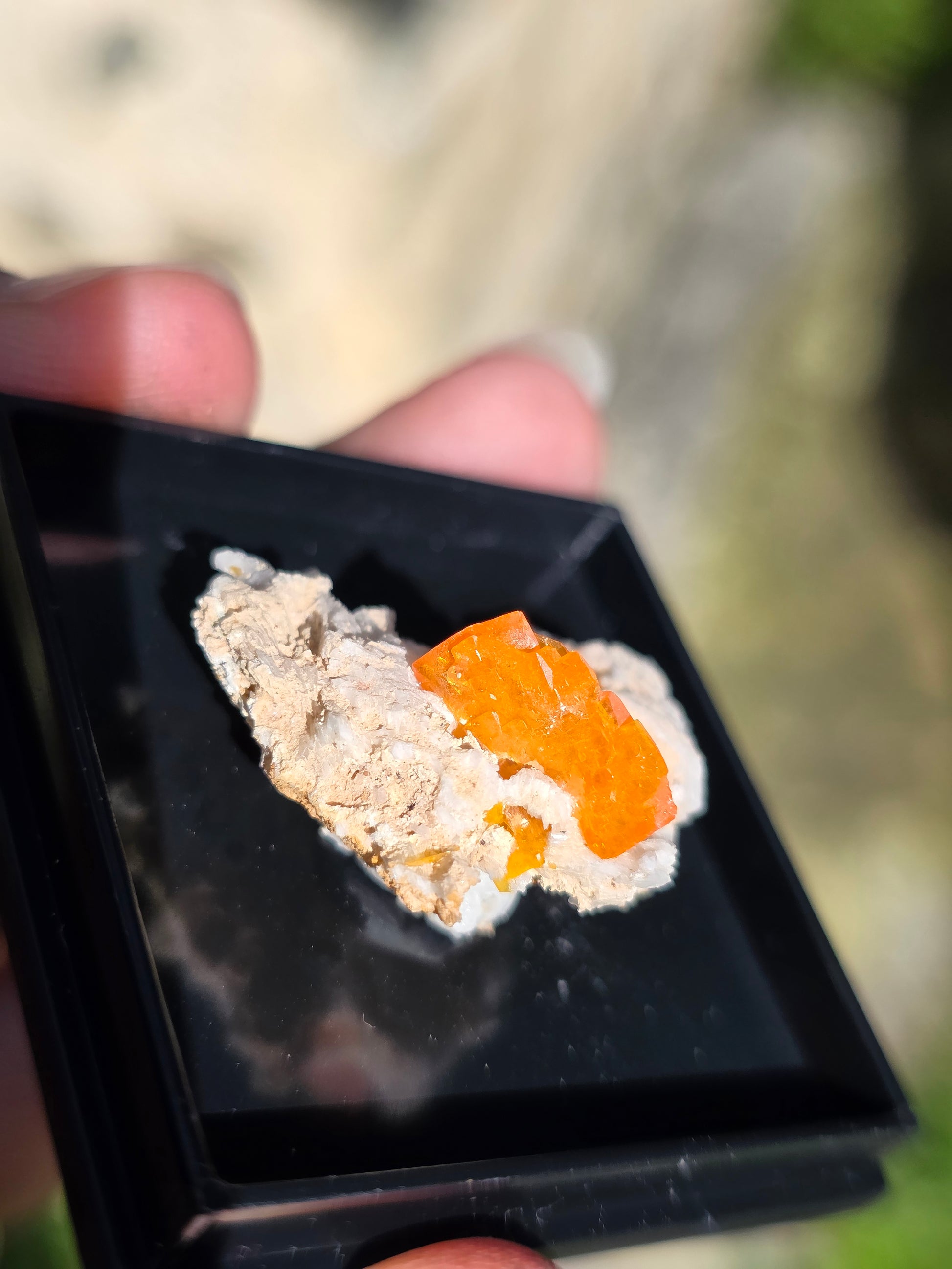 Superbe Wulfénite du Maroc vendue dans sa petite boîte vitrine.