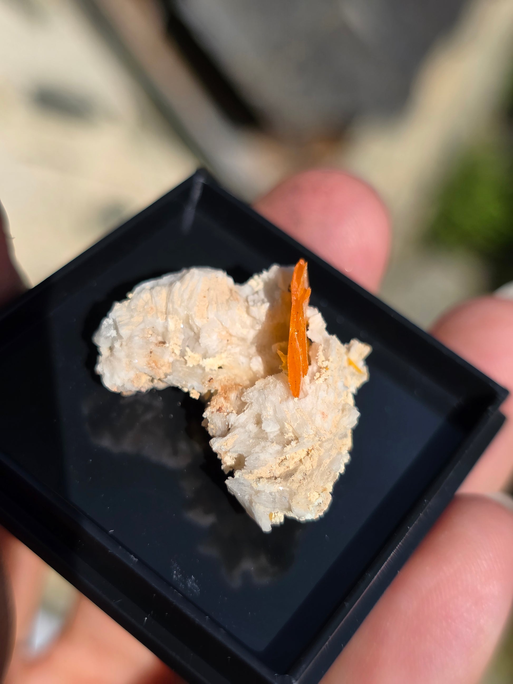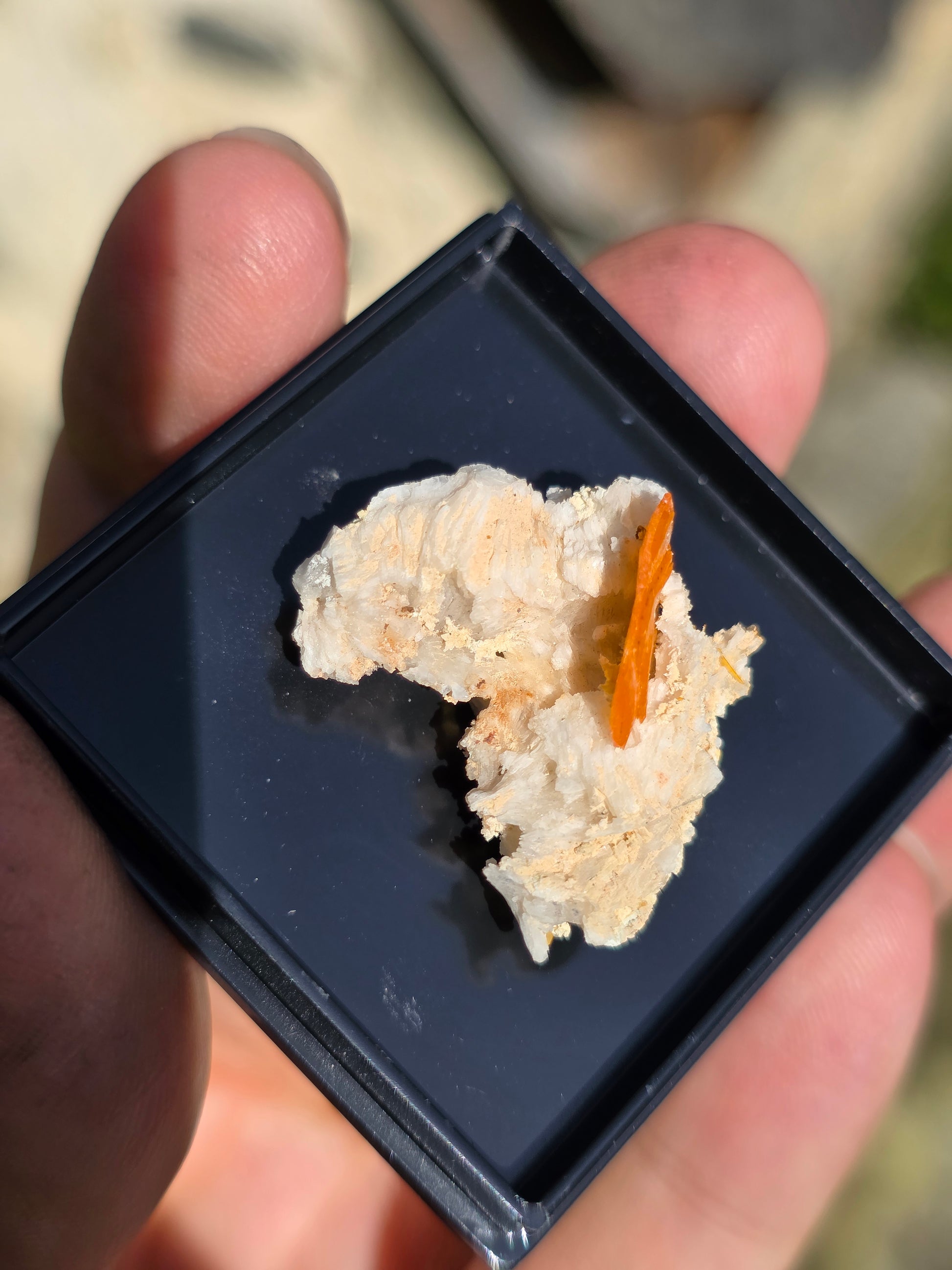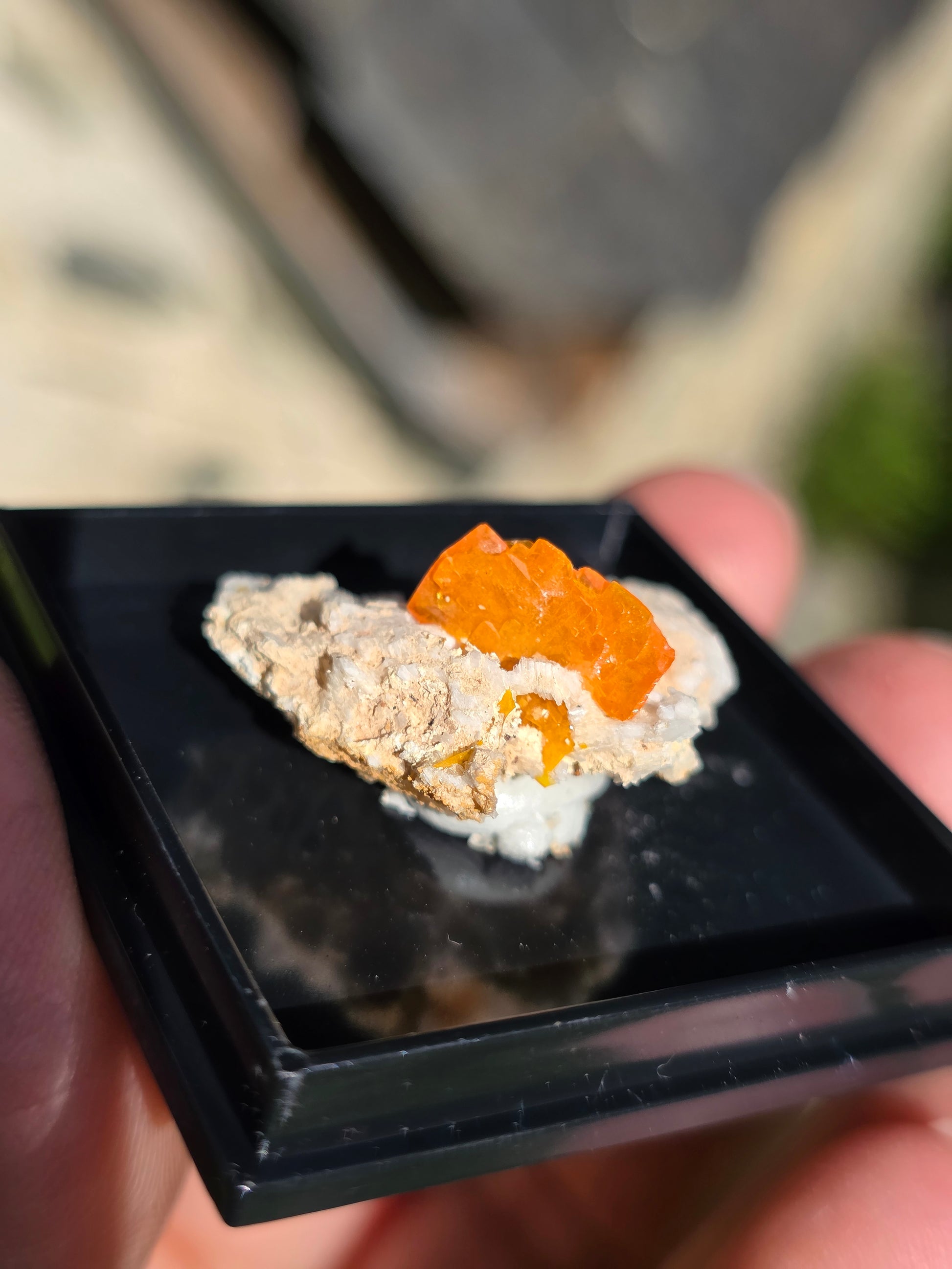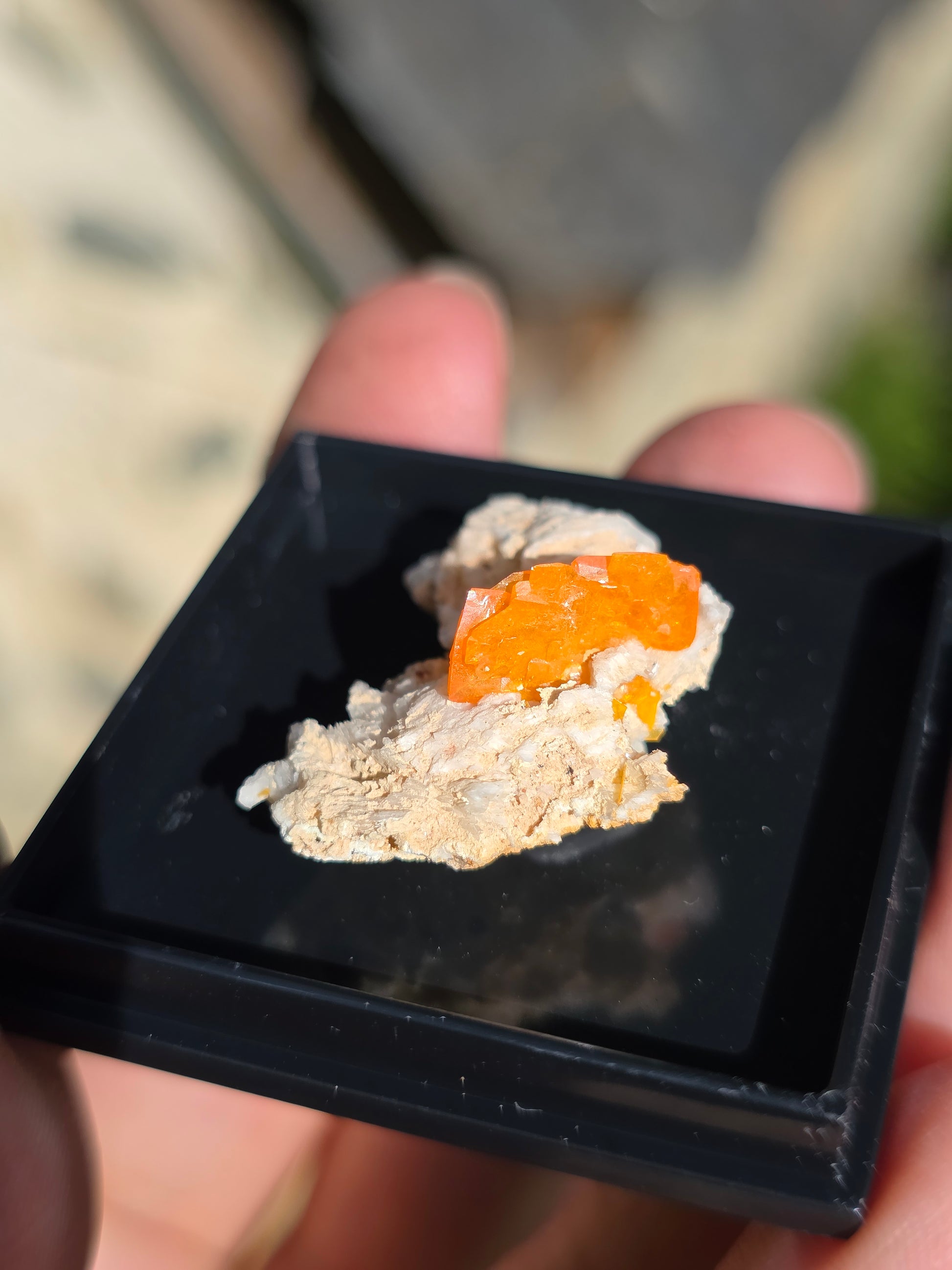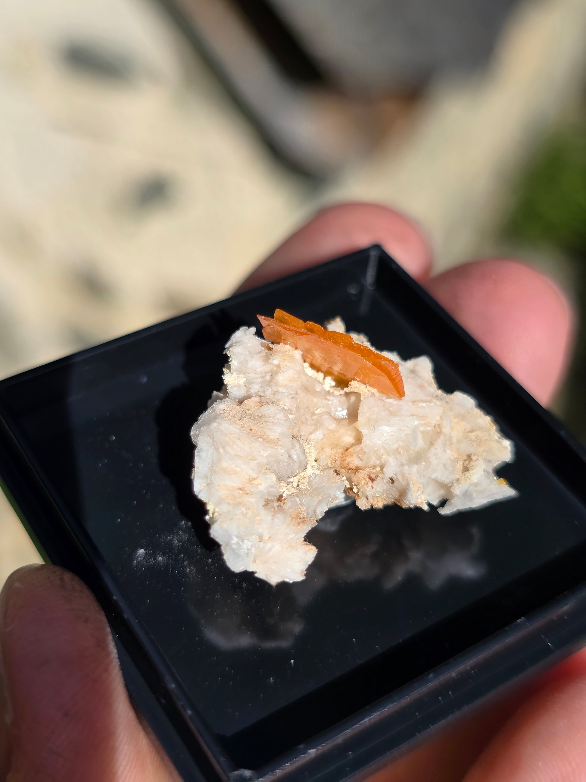 Superbe Wulfénite du Maroc vendue dans sa petite boîte vitrine.